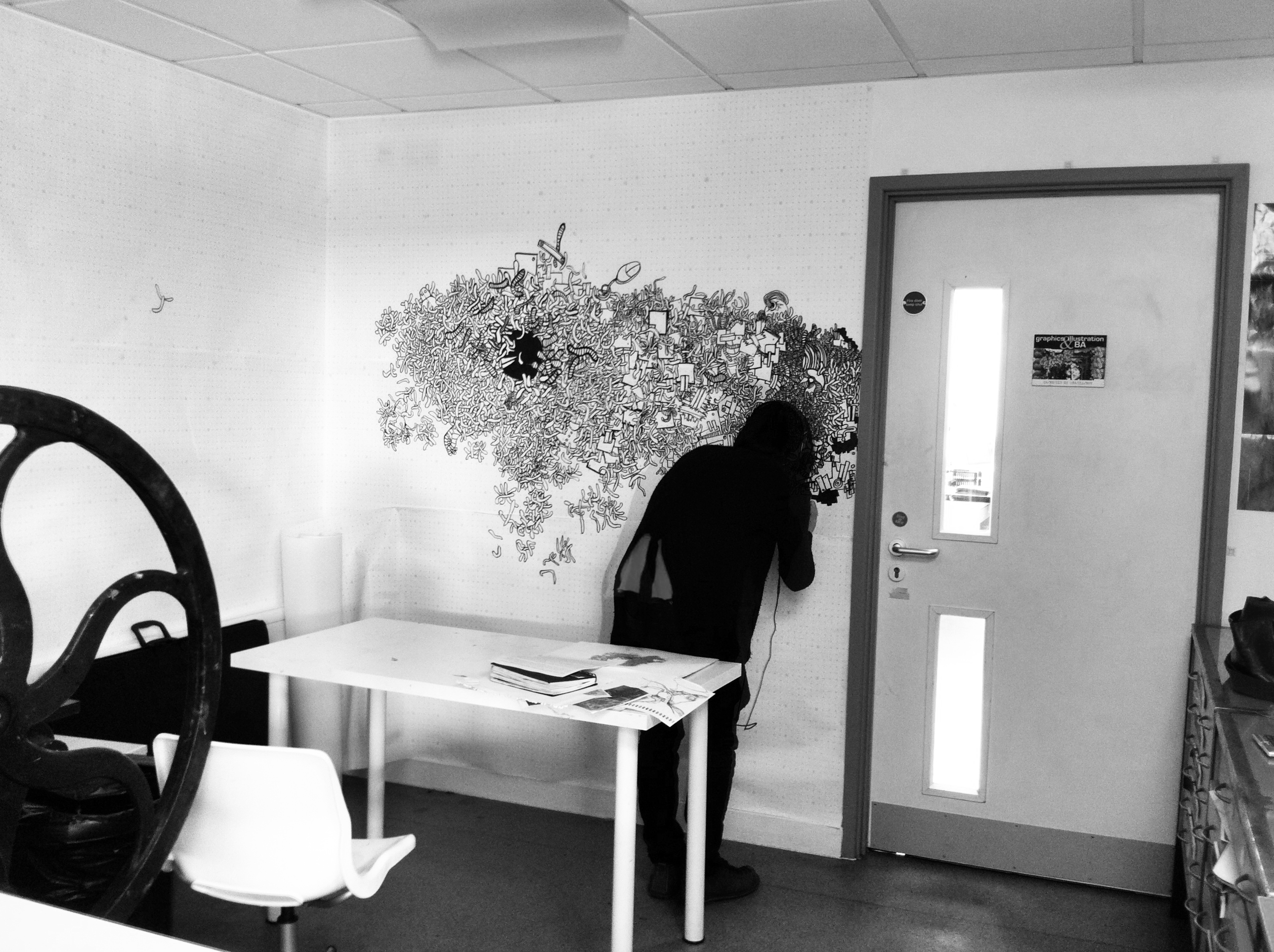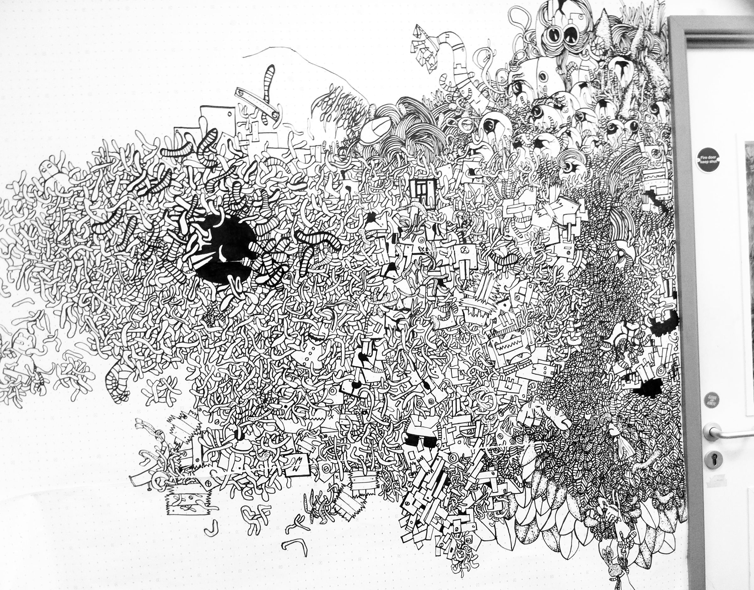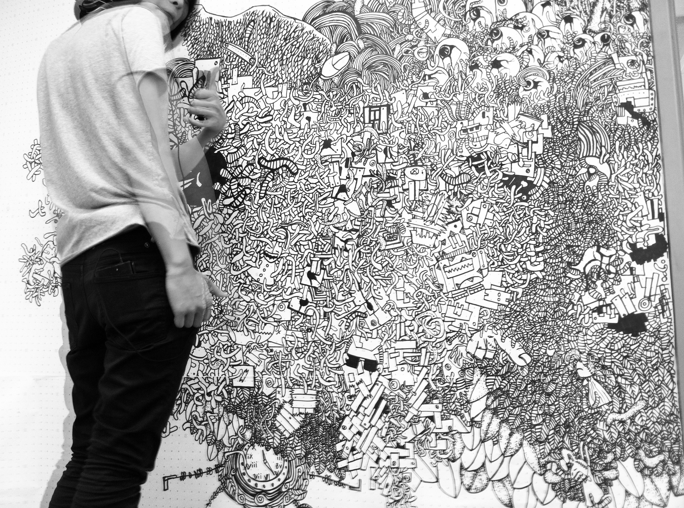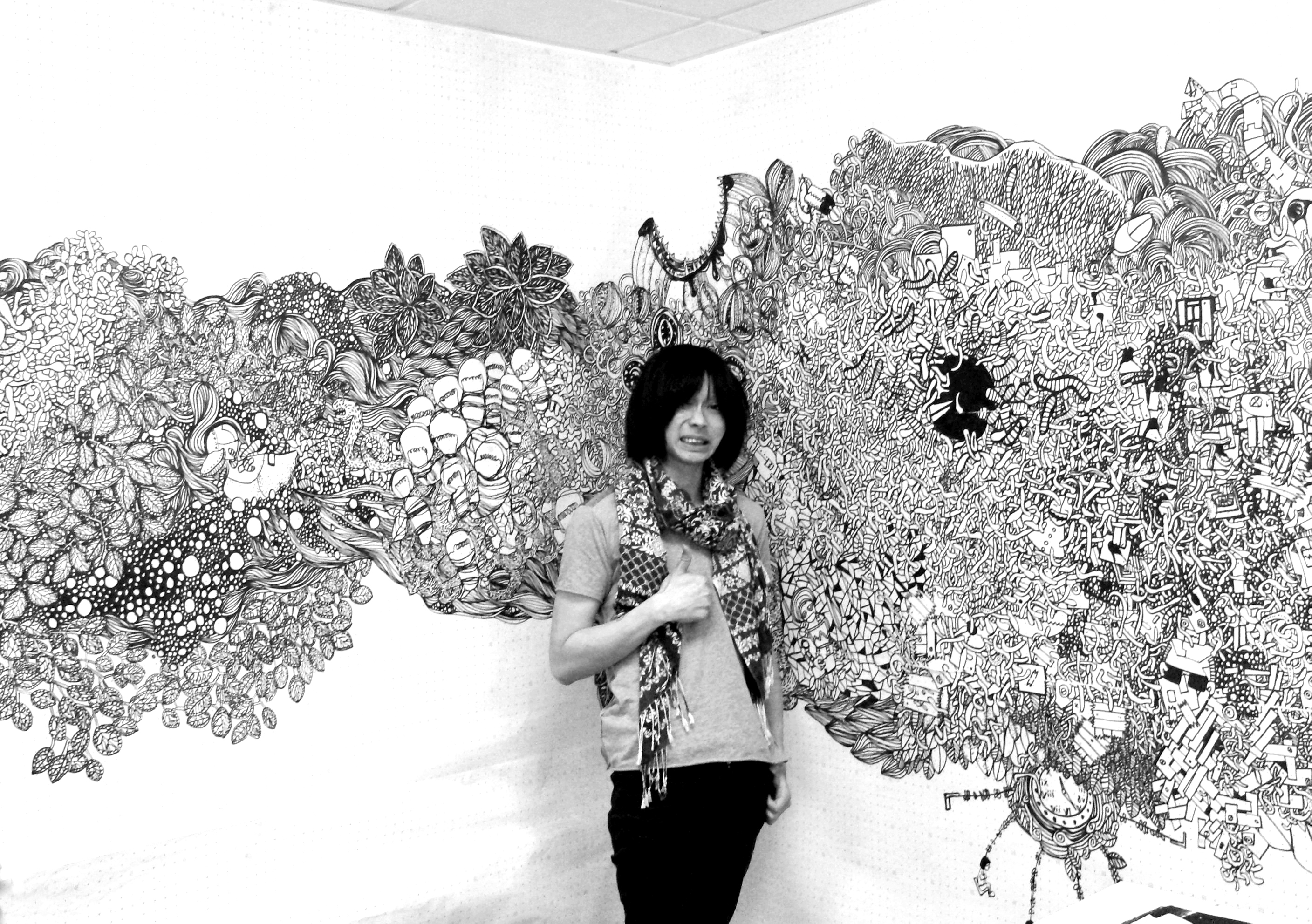Yet, the final form of my creation was a mystery, unplanned and unexpected. My respected mentor, Mandy Doyle, did not hesitate much and immediately asked me to paint on the wall. She told me to try it out on paper first, to test it multiple times in a small area, take photos of the painting process, and put-up various ideas from my sketchbook on the wall. No one expected that once I started, I wouldn’t stop, painting far larger than expected and completing it in one go.