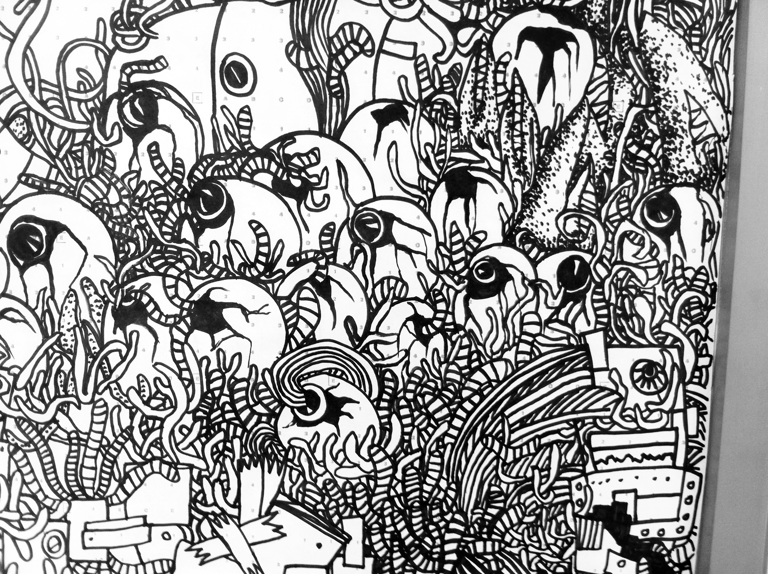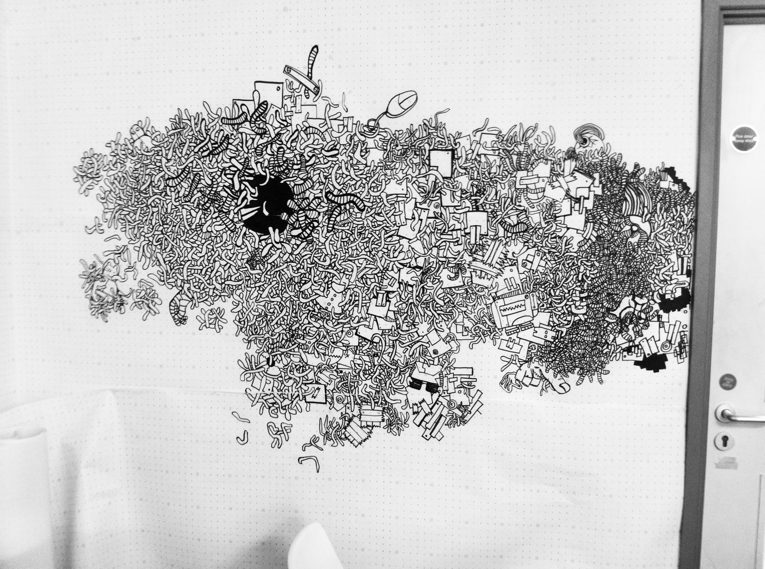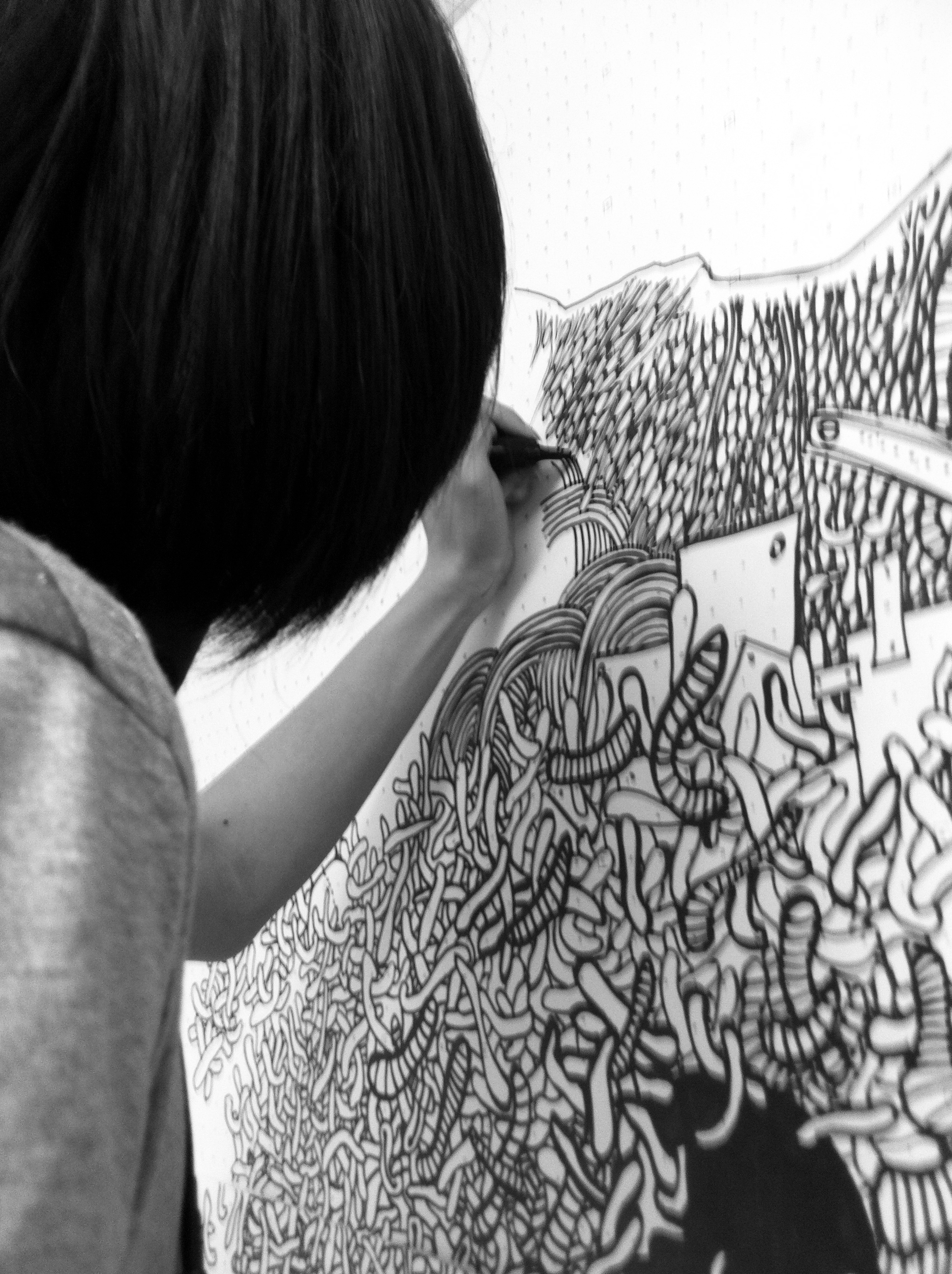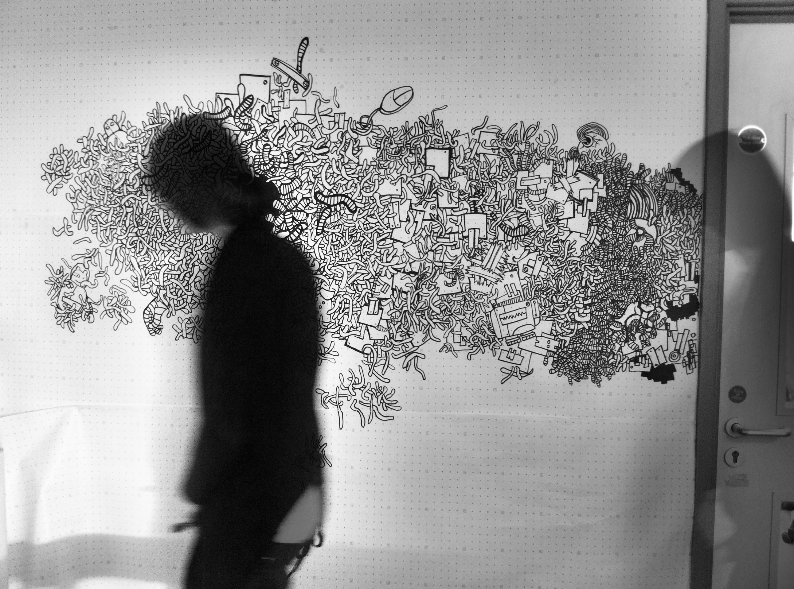 Yet, the final form of my creation was a mystery, unplanned and unexpected. My respected mentor, Mandy Doyle, did not hesitate much and immediately asked me to paint on the wall. She told me to try it out on paper first, to test it multiple times in a small area, take photos of the painting process, and put-up various ideas from my sketchbook on the wall. No one expected that once I started, I wouldn’t stop, painting far larger than expected and completing it in one go.