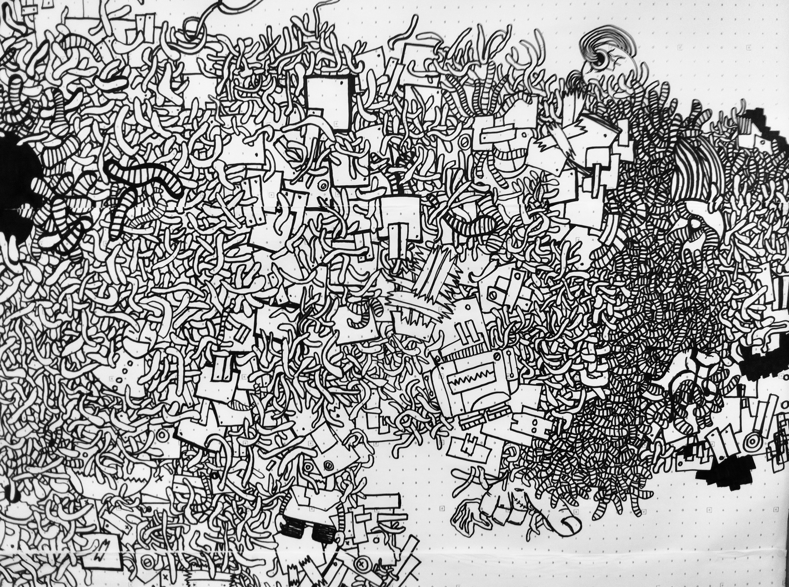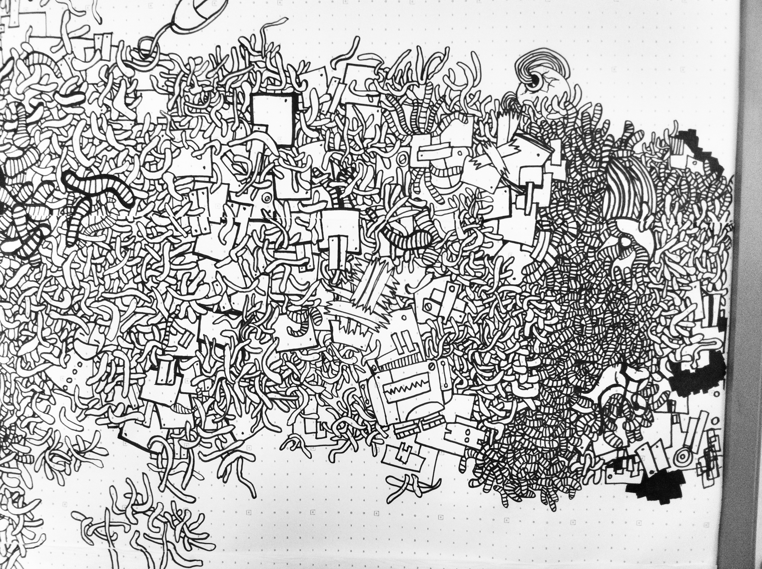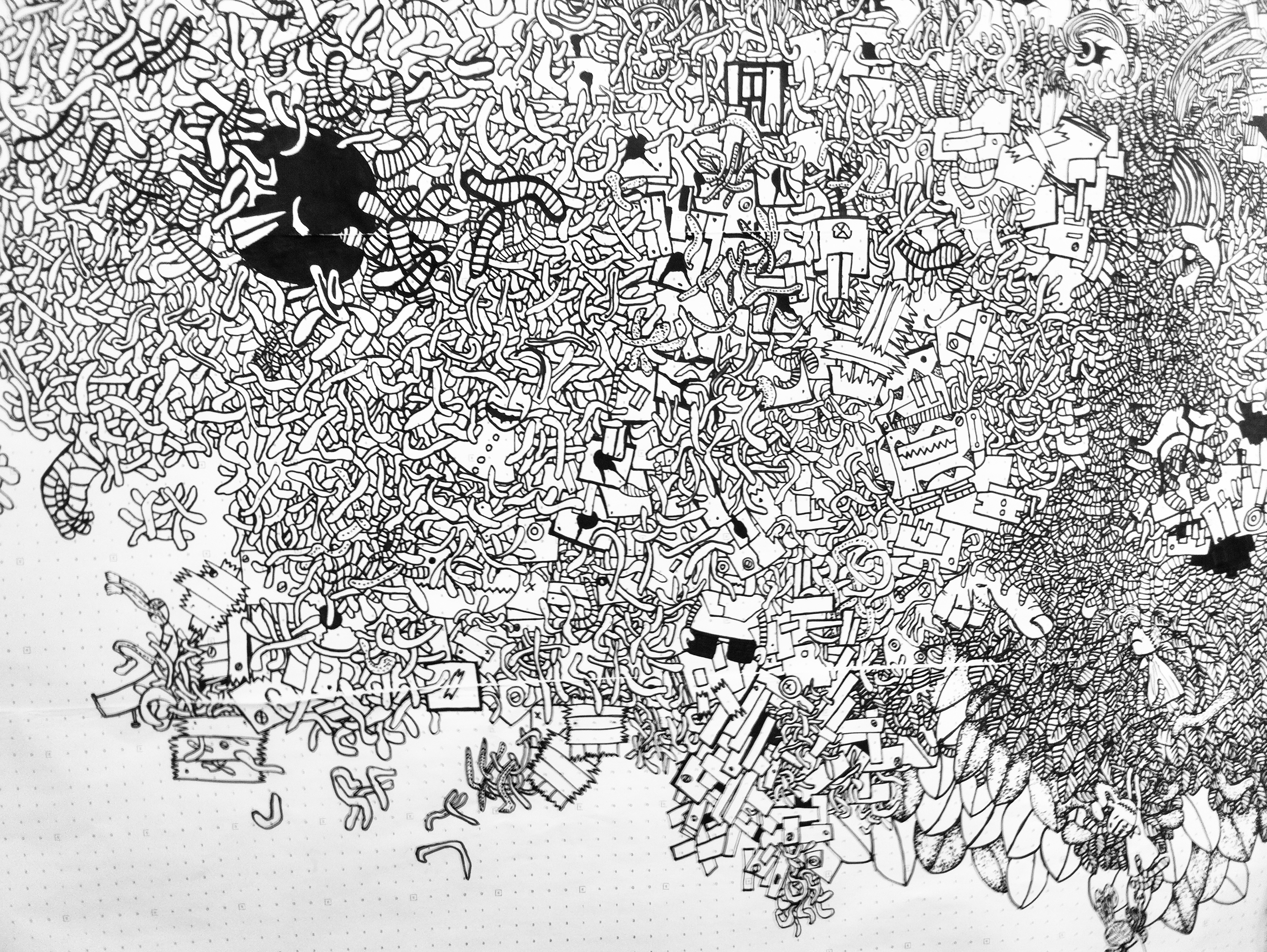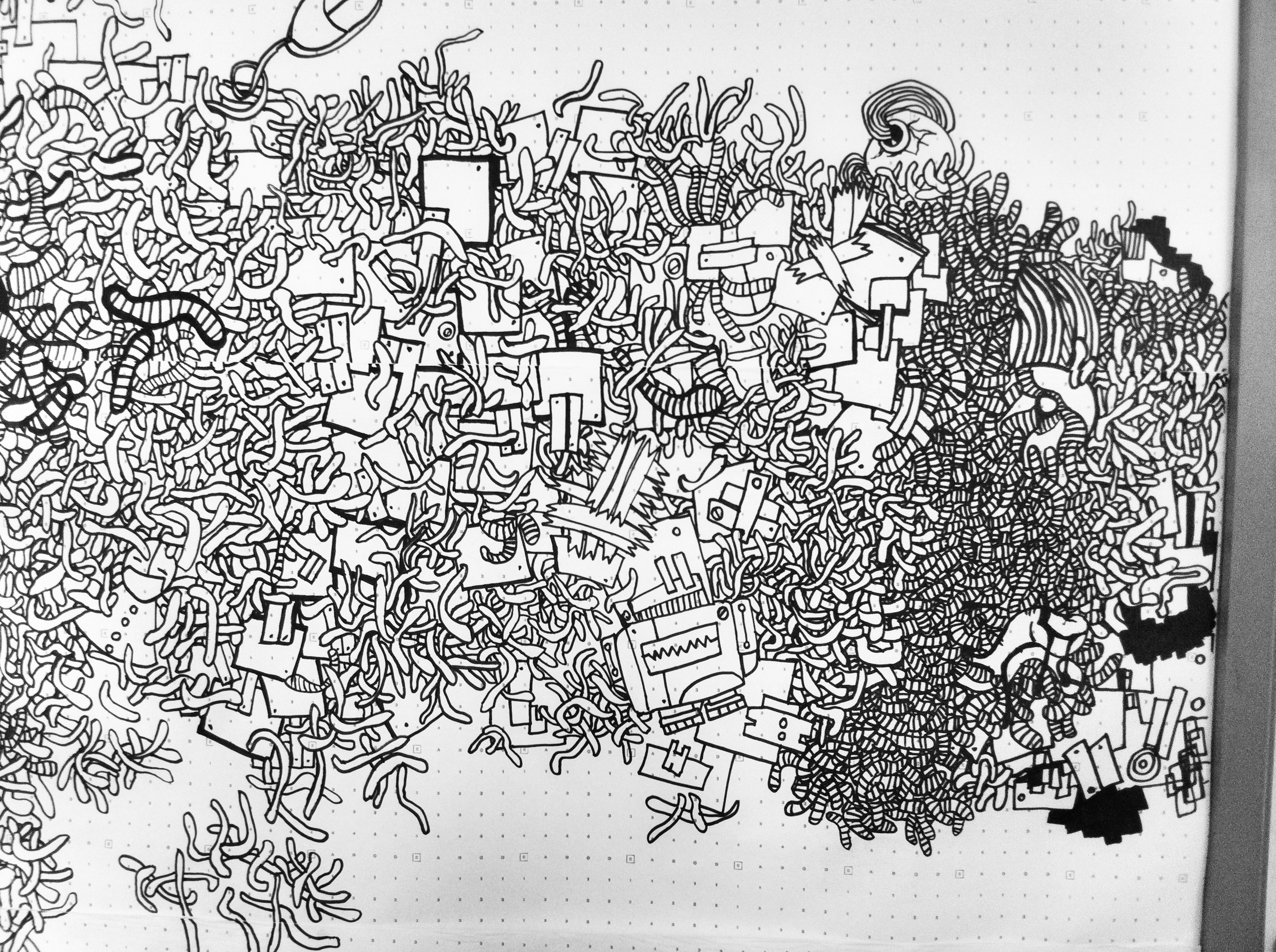 Yet, the final form of my creation was a mystery, unplanned and unexpected. My respected mentor, Mandy Doyle, did not hesitate much and immediately asked me to paint on the wall. She told me to try it out on paper first, to test it multiple times in a small area, take photos of the painting process, and put-up various ideas from my sketchbook on the wall. No one expected that once I started, I wouldn’t stop, painting far larger than expected and completing it in one go.