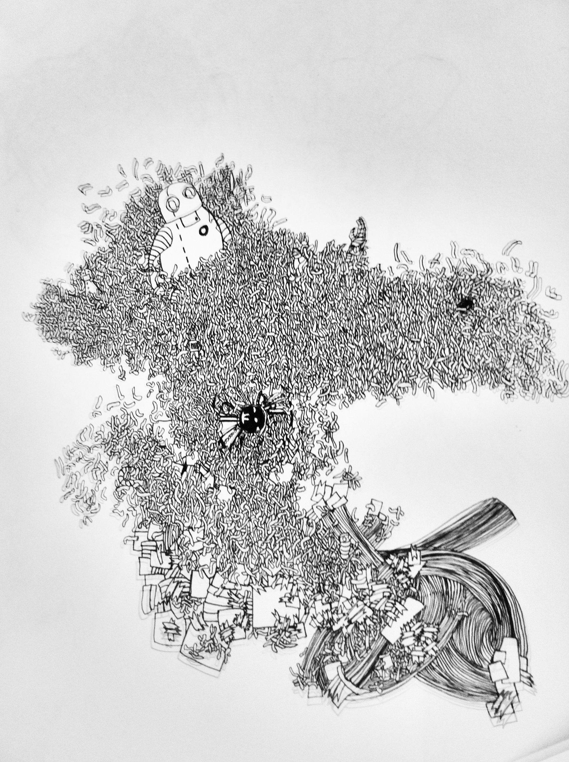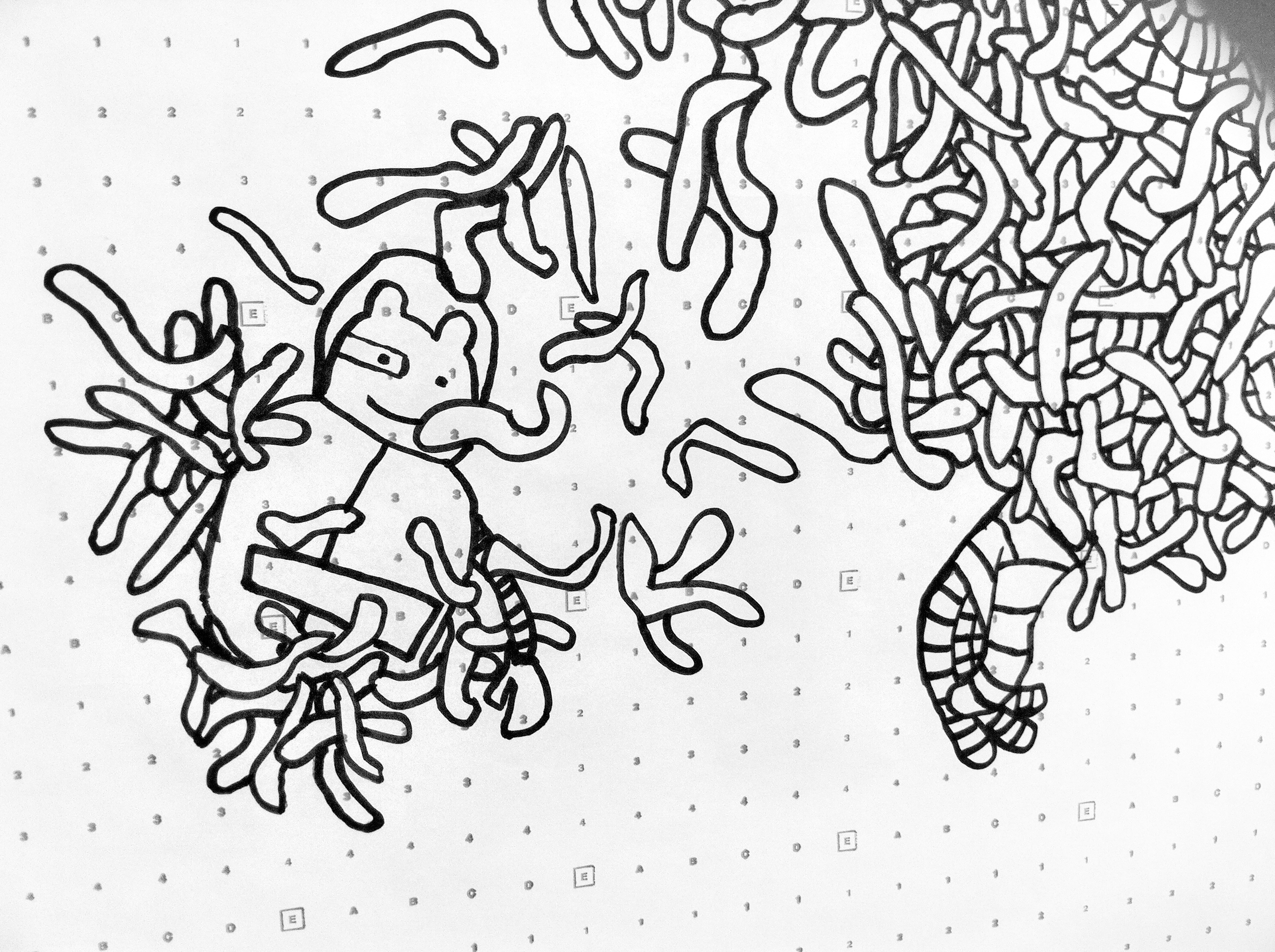 這是我第一次畫這麼大幅的畫,還要畫在當時就讀的英國學校 CSVPA 的牆上。說來有些慚愧,也感到非常感恩,因為我從來沒想到自己的潛力能夠達到這樣的高度。比如說,我從來沒有想過要畫這樣大的畫,也沒有想到作品的複雜程度會達到這種程度。起初,我在素描本上畫下了許多想法。有時候用 Photoshop 砌來砌去,看看效果。但實際上,我從來沒有計劃過成品會是怎樣的。尊敬的導師 Mandy Doyle 幾乎沒有猶豫,立刻鼓勵我在牆上畫。她建議我先在紙上試試,在一個小區域多次嘗試,紀錄畫的過程,然後將素描本中不同的想法都展示在牆上。最終,沒有人料到一開始畫後我就沒停過,畫得比預期的大幅,而且是一氣呵成。